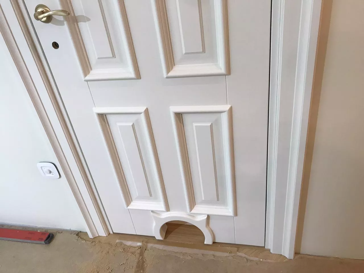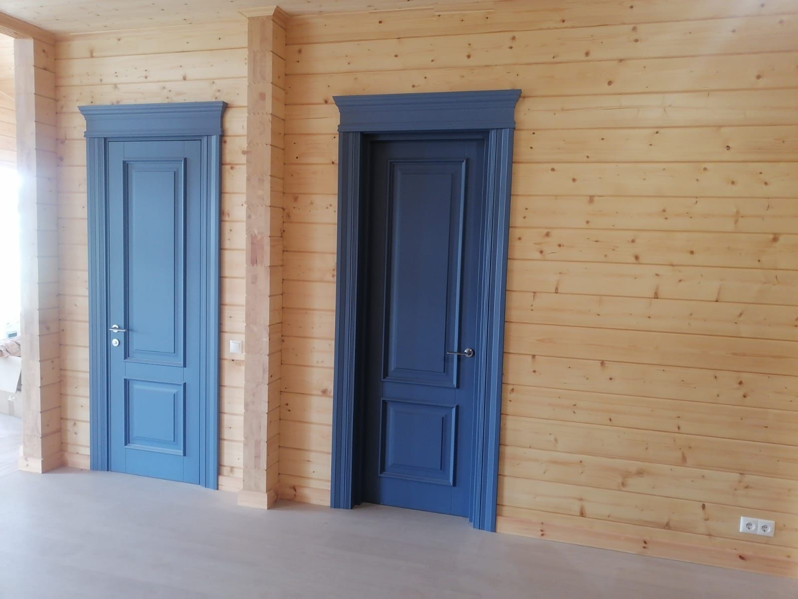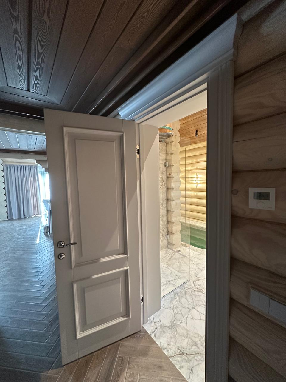 Полотно тамбуратное из инженерного массива (МДФ + ламельный/листельный массив лиственных пород) толщиной 50 мм. с повышенной шумоизоляцией,окра шенное матовыми красками итальянского производства SIRCA с эффектом «soft touch» по шкале RAL с возможностью двусторонней окраски. Объемные филенки, стекла крепятся к полотну с помощью фигурных штапиков (багетов).