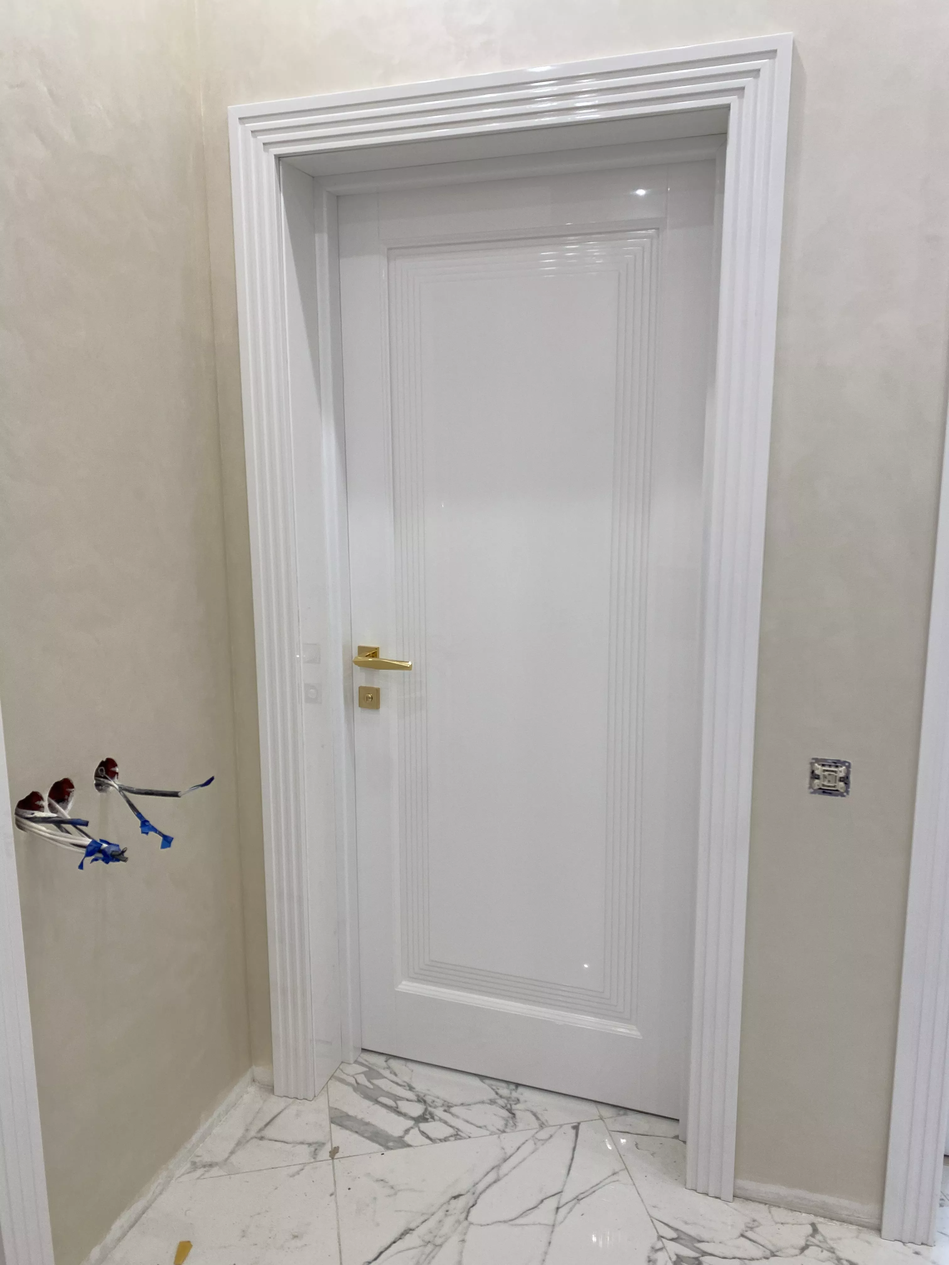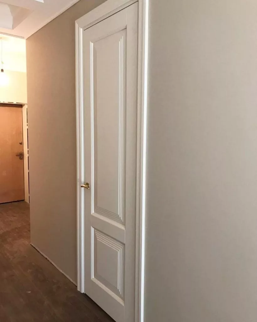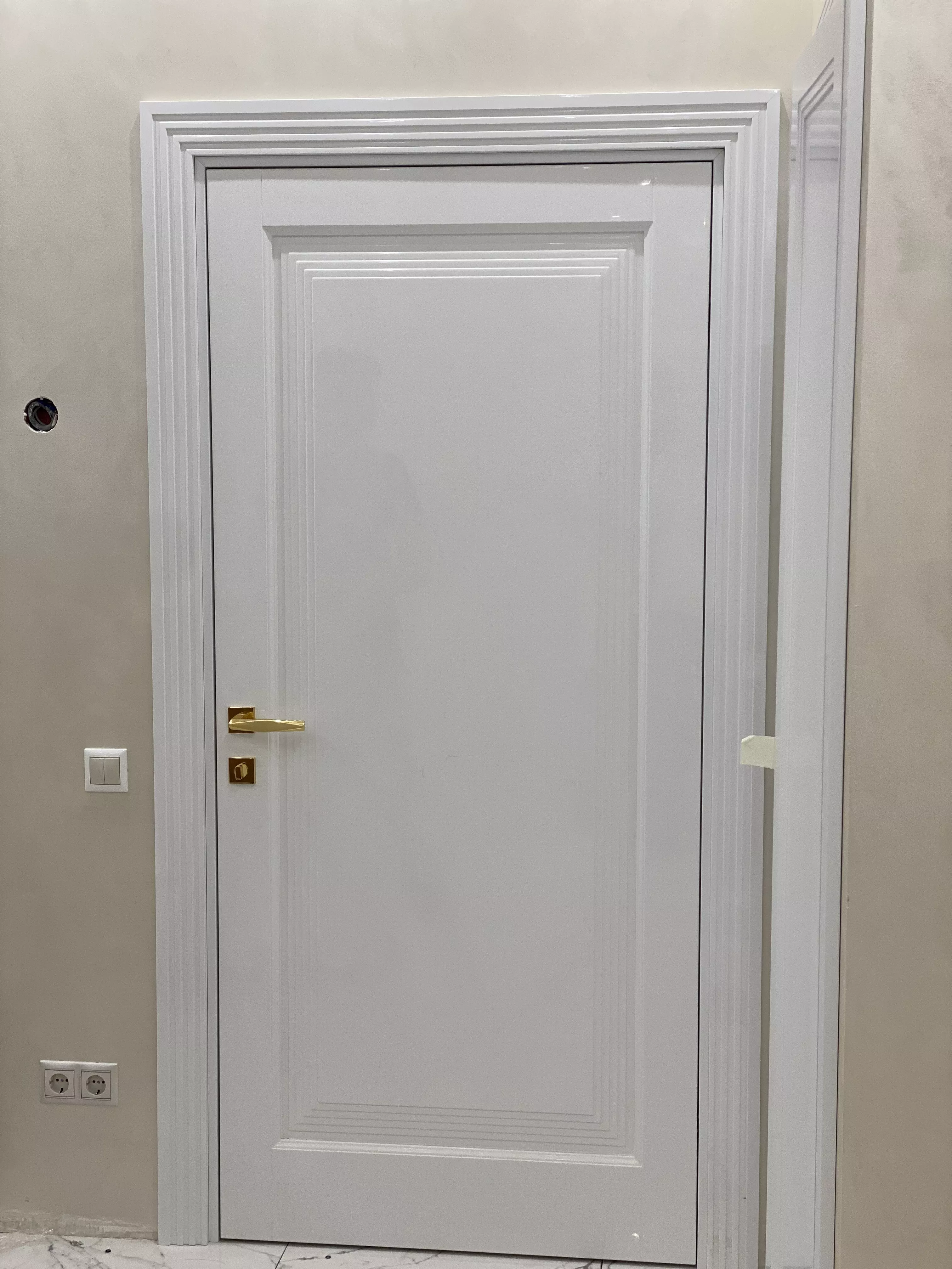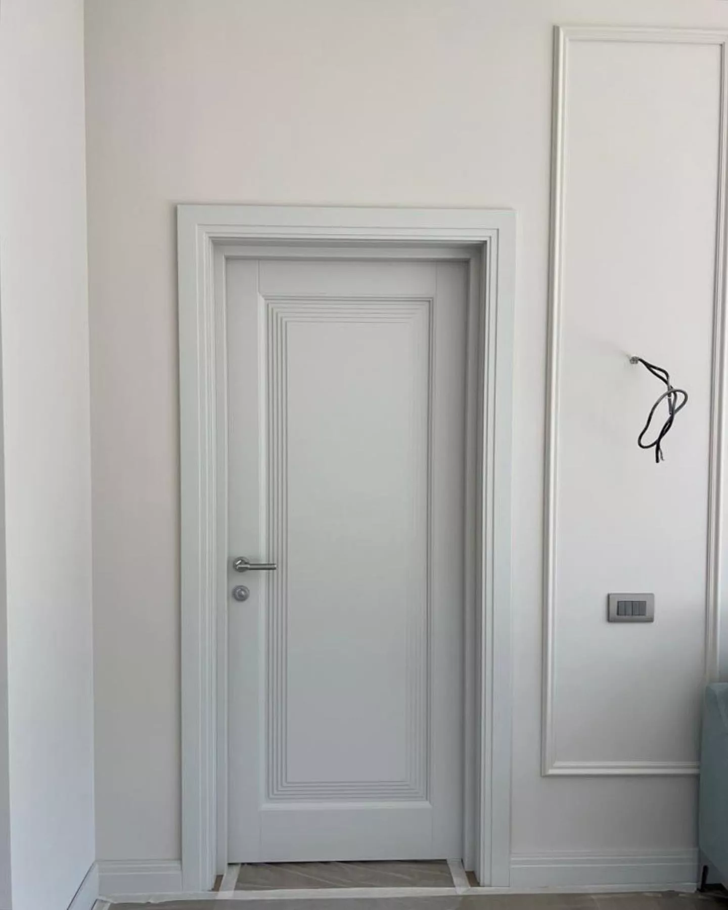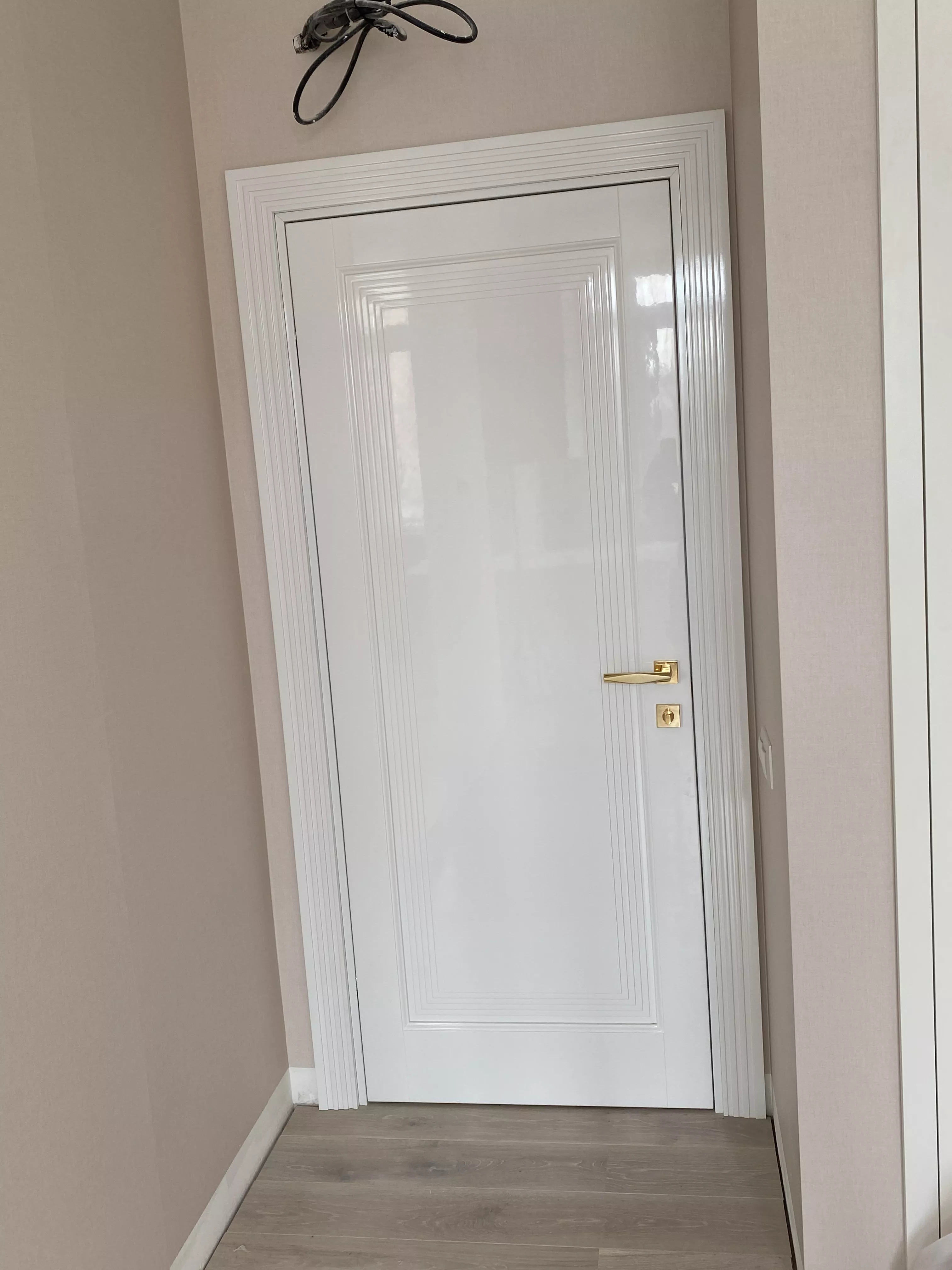 Элегантная дверь с экспрессивными формами. В ее стиле при кажущейся массивности присутствует необычная легкость. Строгие формы фрезерованных дверных панелей удивительным образом сочетаются с широкими наличниками трапециевидной формы, создавая уникальную композицию, которая вызывает подлинное восхищение.