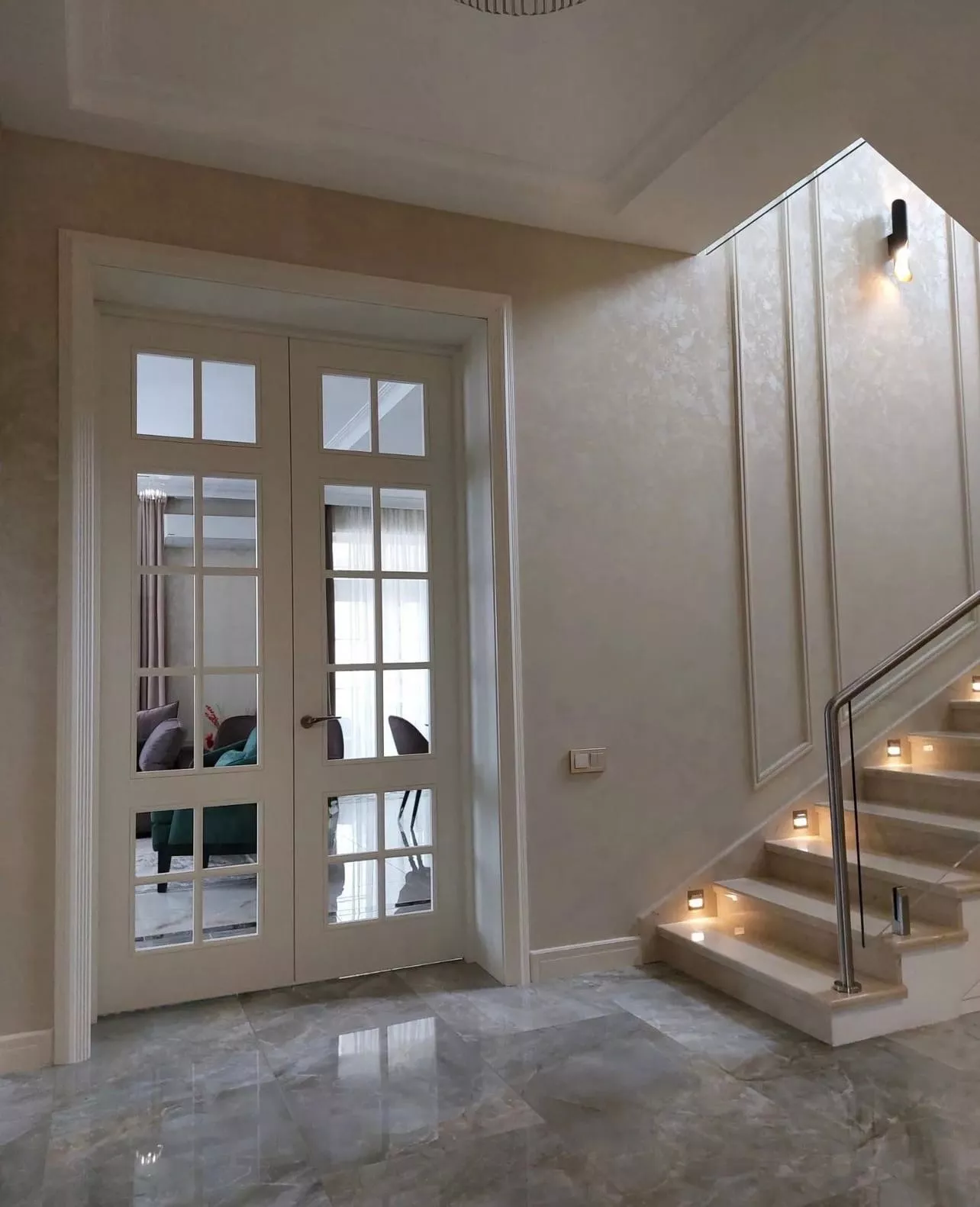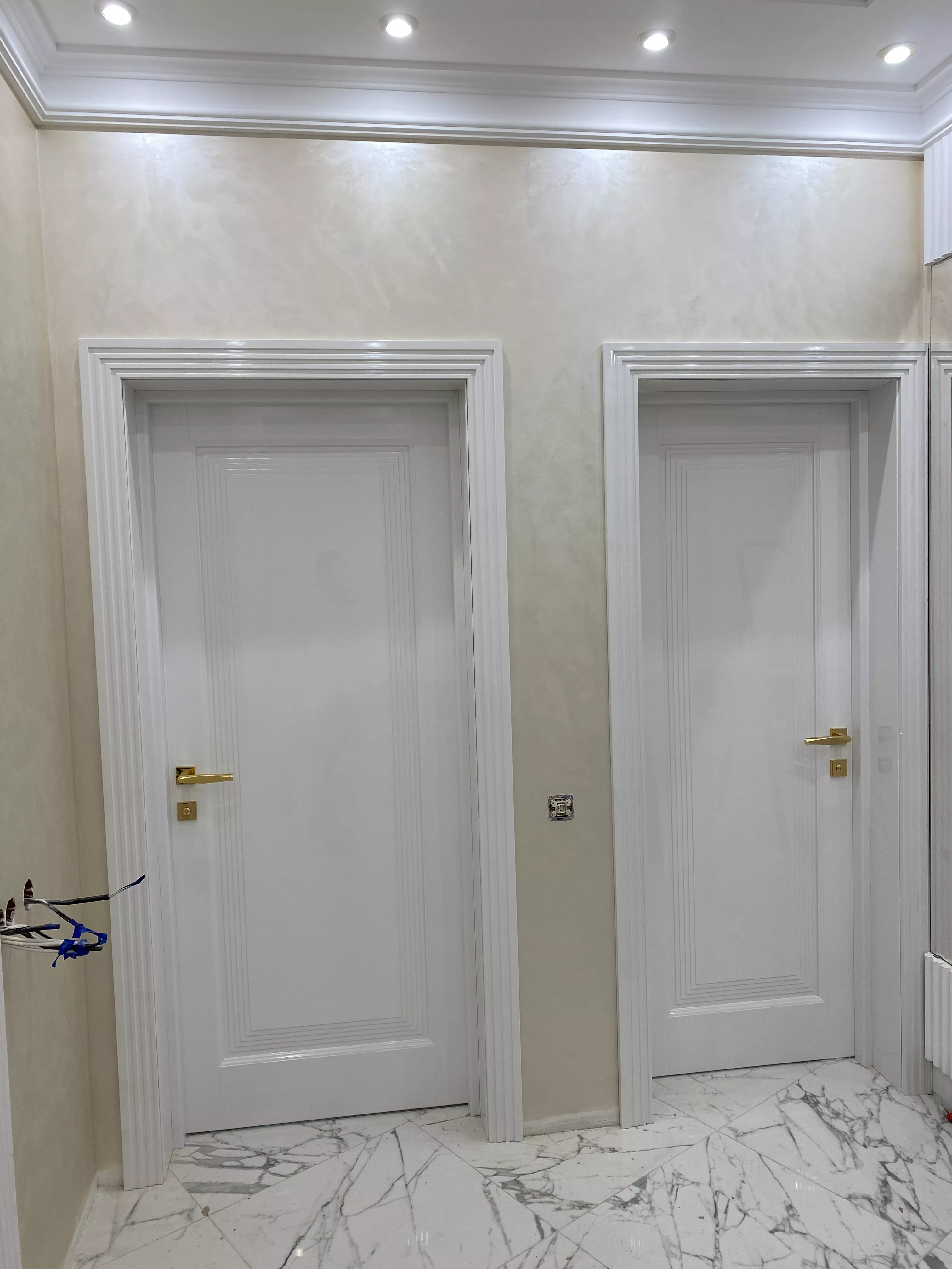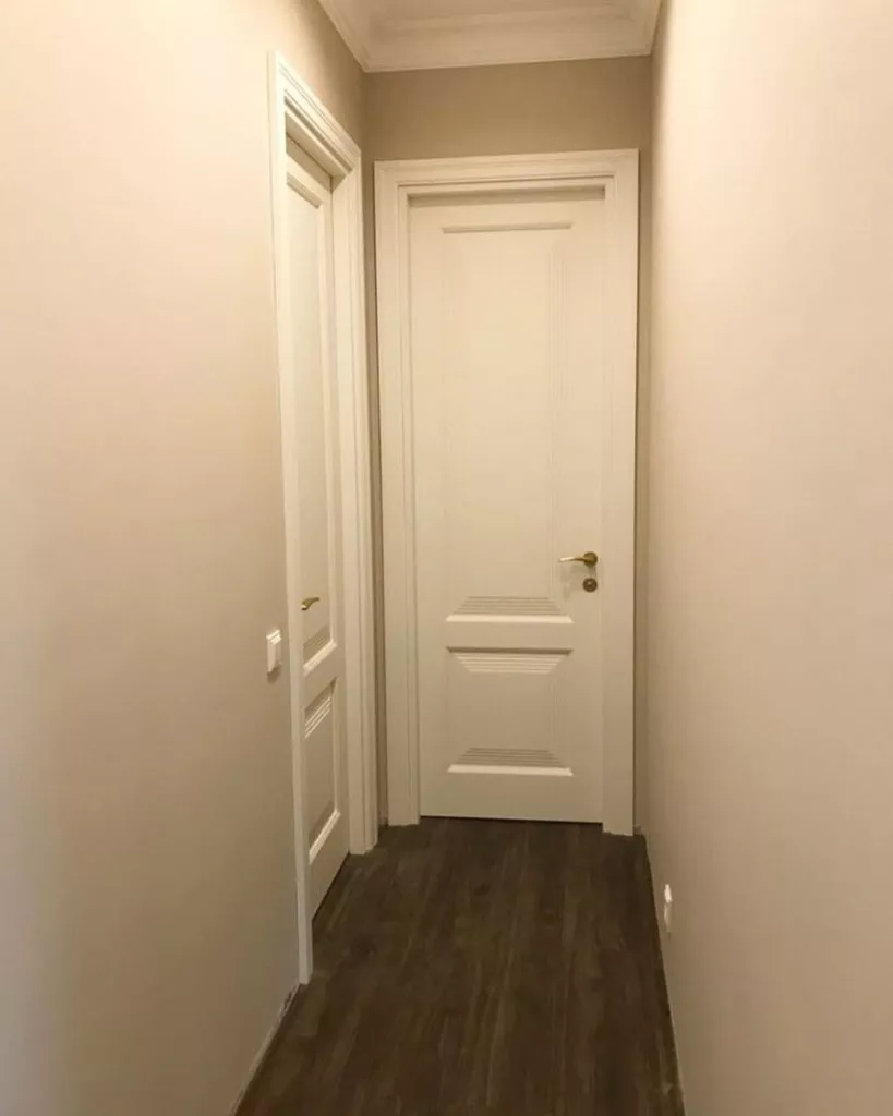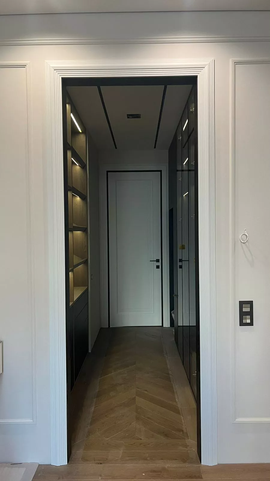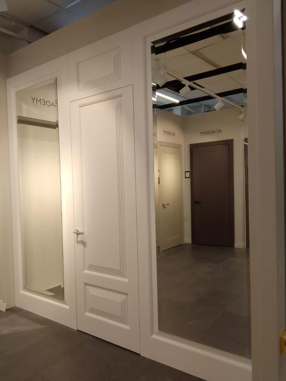 Элегантная дверь с экспрессивными формами. В ее стиле при кажущейся массивности присутствует необычная легкость. Строгие формы фрезерованных дверных панелей удивительным образом сочетаются с широкими наличниками трапециевидной формы, создавая уникальную композицию, которая вызывает подлинное восхищение.